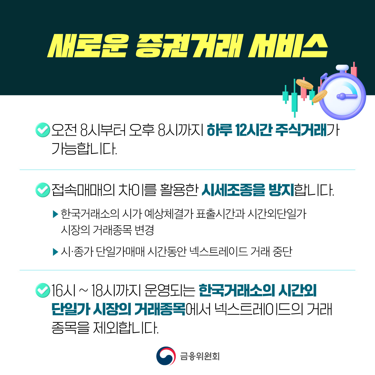 기존 KRX보다 거래 시간이 크게 늘어나 투자자들에게 더 많은 기회를 제공합니다.