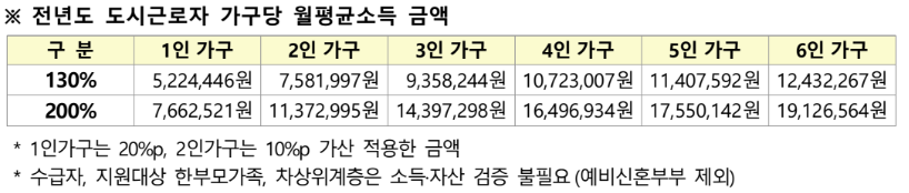 - 외벌이 가구: 전년도 도시근로자 가구당 월평균 소득의 130% 이하