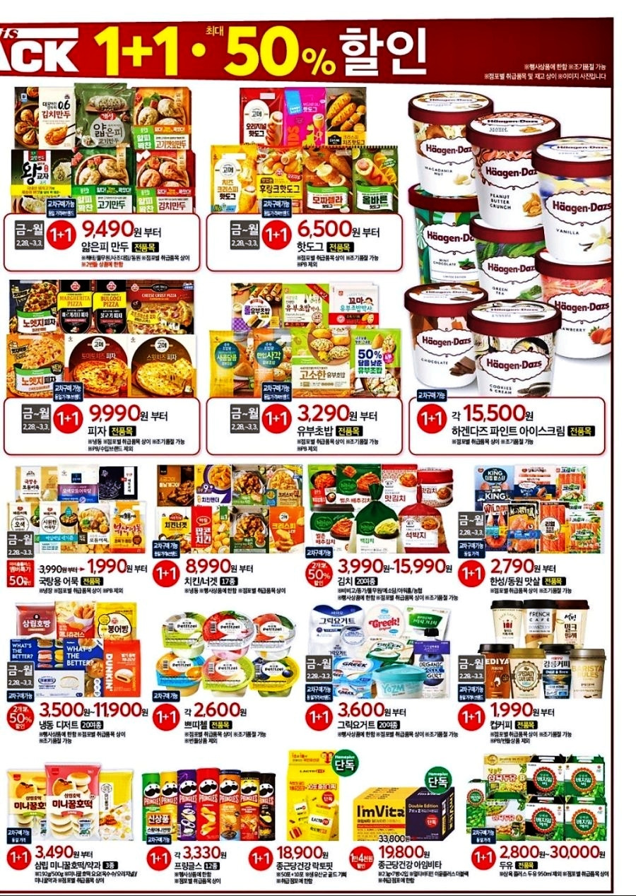 - 즉석밥, 라면, 간식류 – 1+1 행사 & 최대 50% 할인